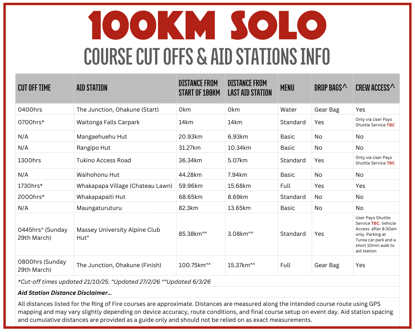 This is the time you must LEAVE the aid station – not arrive. Please ensure you are aware of the cut-off times – these will be strictly enforced for your safety. If this is your first time doing an Ultra or you are unsure if you can make the cut-offs, we recommend you try the 60km distance, the Ring of Fire Relay with friends, or a lesser Tussock Traverse (also on the 28th March 2026 and sharing some of the Ring of Fire Course) distance this year, see how it goes and come back next year and have another crack at the longer event.